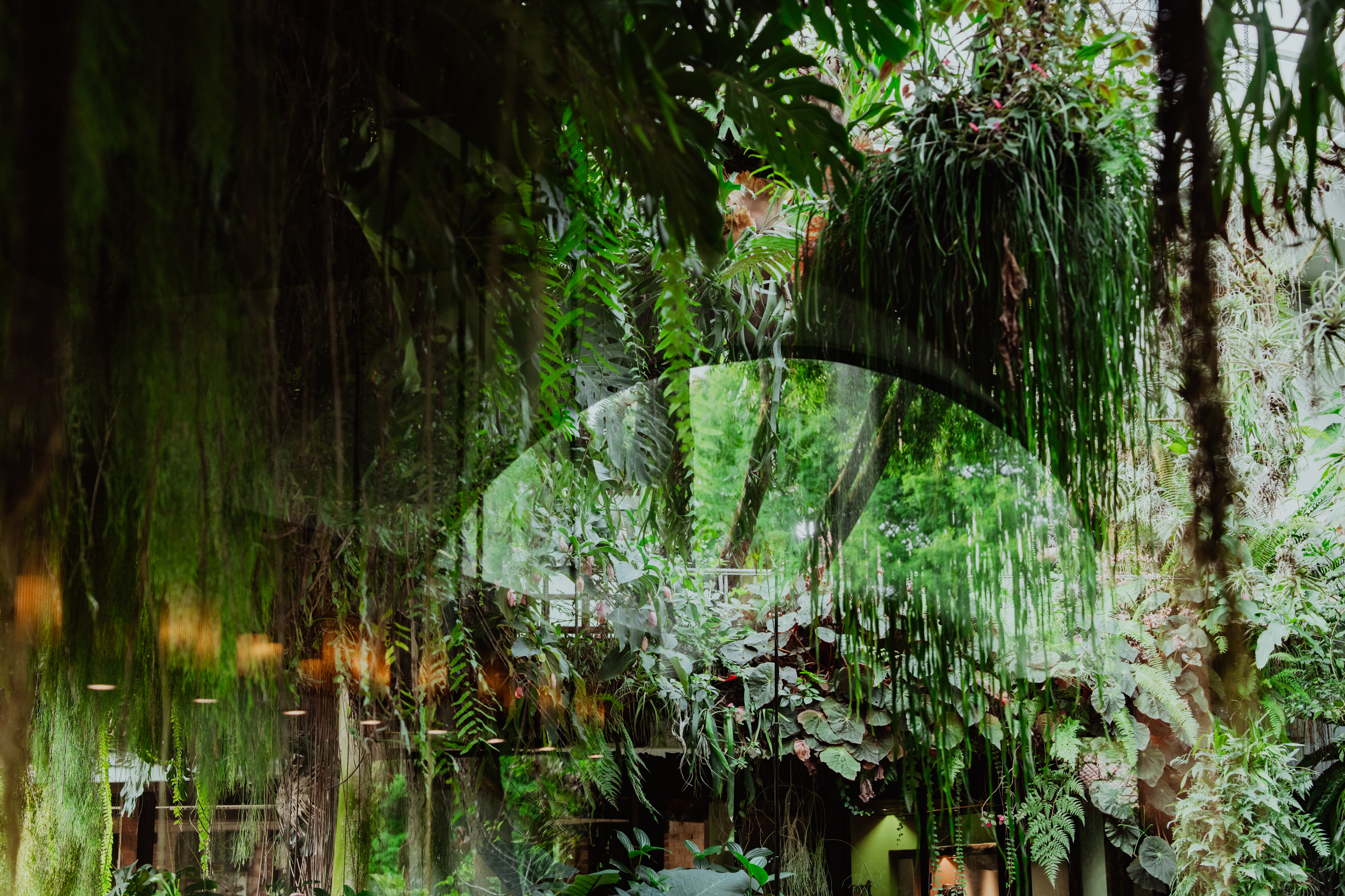 除此之外,館內與園區還蘊藏著無數細節:一千七百多個農村時代的舊石磨,化作庭園舖面,不僅耐壓保水,更承載消逝的時代情懷;製造業時期的線雕模板鐵框被轉化為花窗屏風,展現工業之美的細緻紋理;台灣自來水廠近九十年歷史的濾水檜木,成為天花板格柵,木材表面因長年水流沖刷而留下自然波浪般的刻痕,是來自時間之手的驚嘆創作;舊自行車齒輪拆解後,重新串連燒疊成優雅的雨鏈,瀞隱身於植物之隅;印染鋼模曾經製作出無數令人傾倒的華美織品,退役後則化為如今的門扉鐵件,以細緻紋理靜述說著另一種時尚美學。