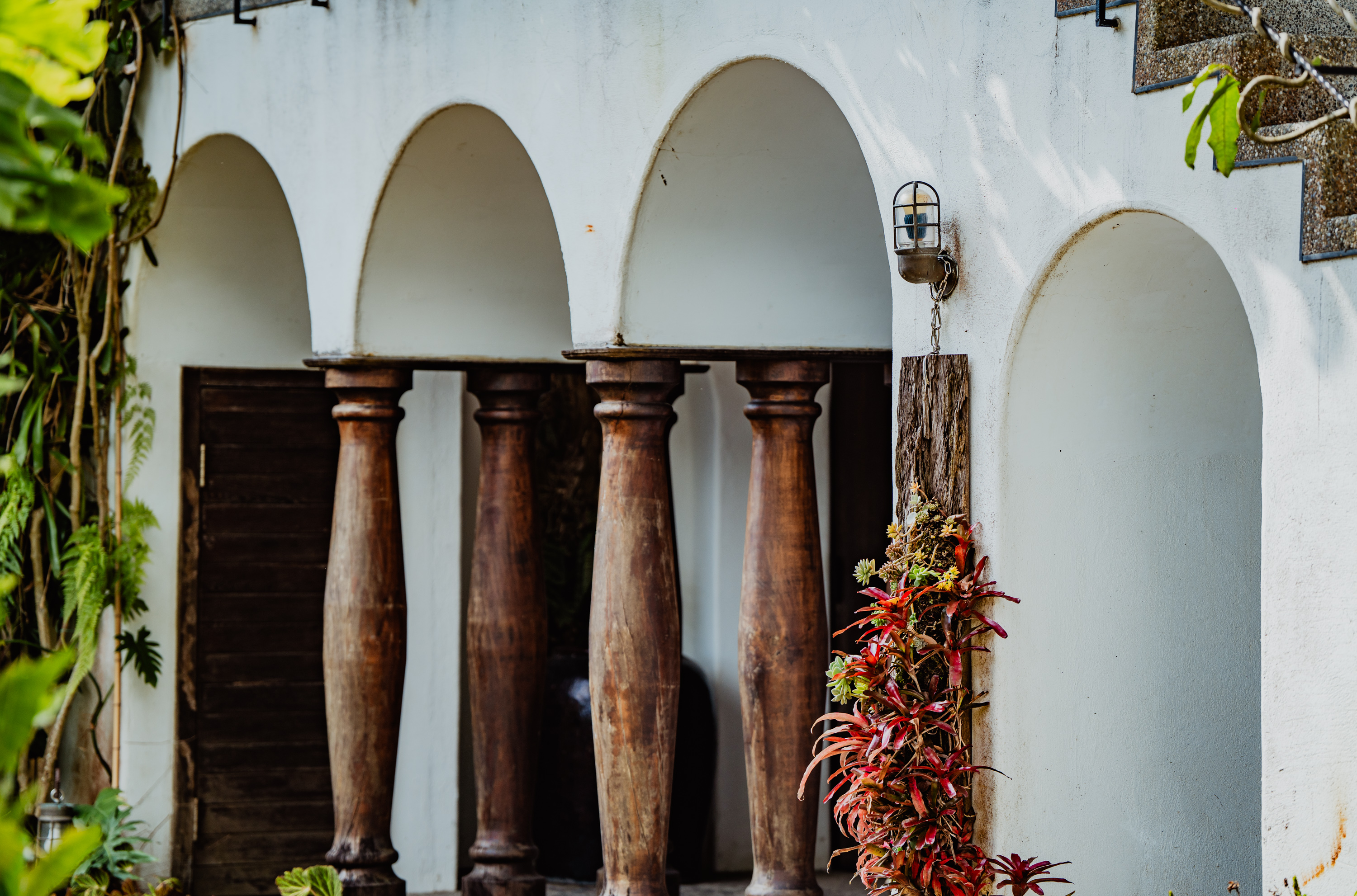 into intricate lattice screens. Nearly ninety-year-old cypress beams, once part