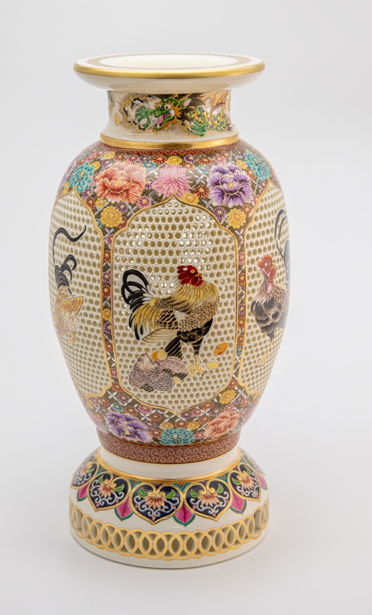 鏤空雕刻被譽為薩摩燒中最難掌握的裝飾形式之一,必須在坯體成形後、陶土尚含水分的短暫時機,以純手工削切雕琢,每一道線條、每一處細節都考驗大師對器形粗細平衡與圖案構成的極致把握,稍有不慎,於高溫燒製過程中便可能前功盡棄。 由於工藝極為繁複,成功率低,能夠全手工完成鏤空雕刻的陶藝家,在日本已屈指可數,而福元弘信正是當代僅存的兩位純手工鏤空雕刻大師之一。